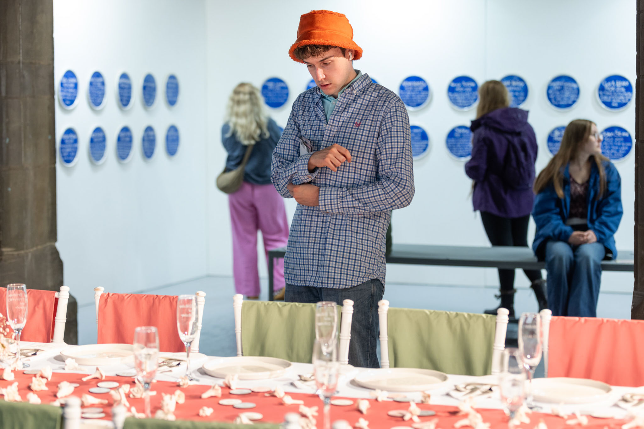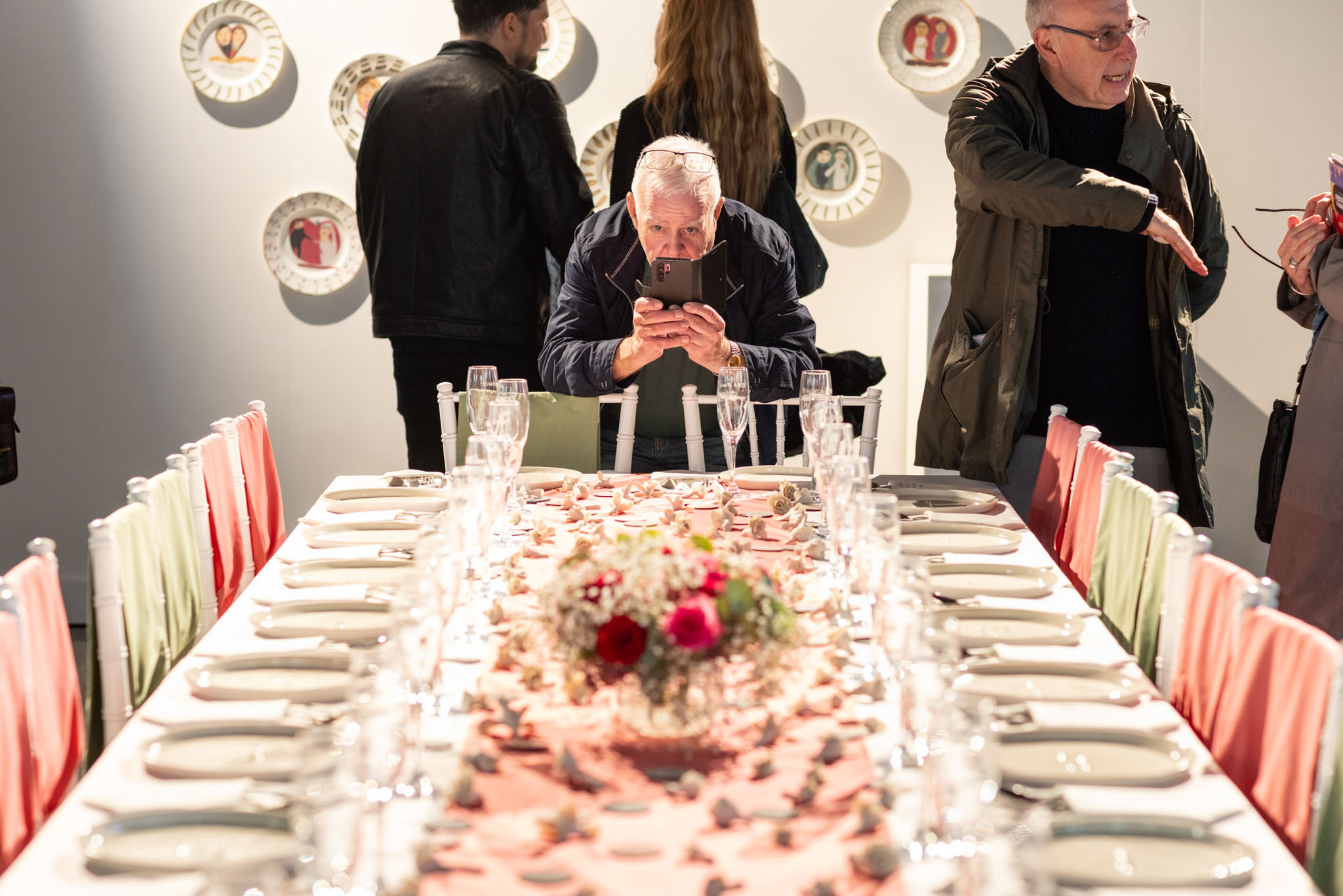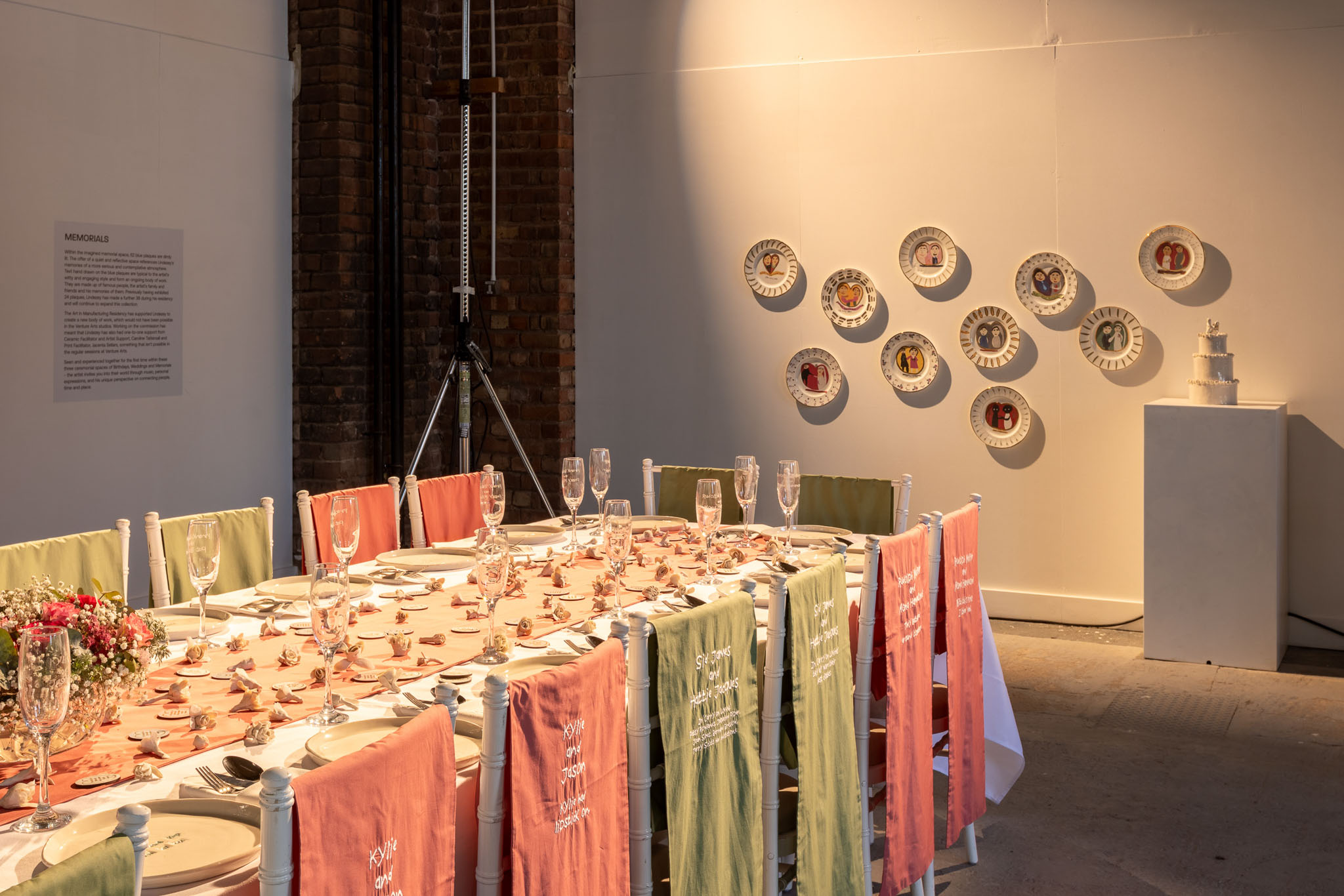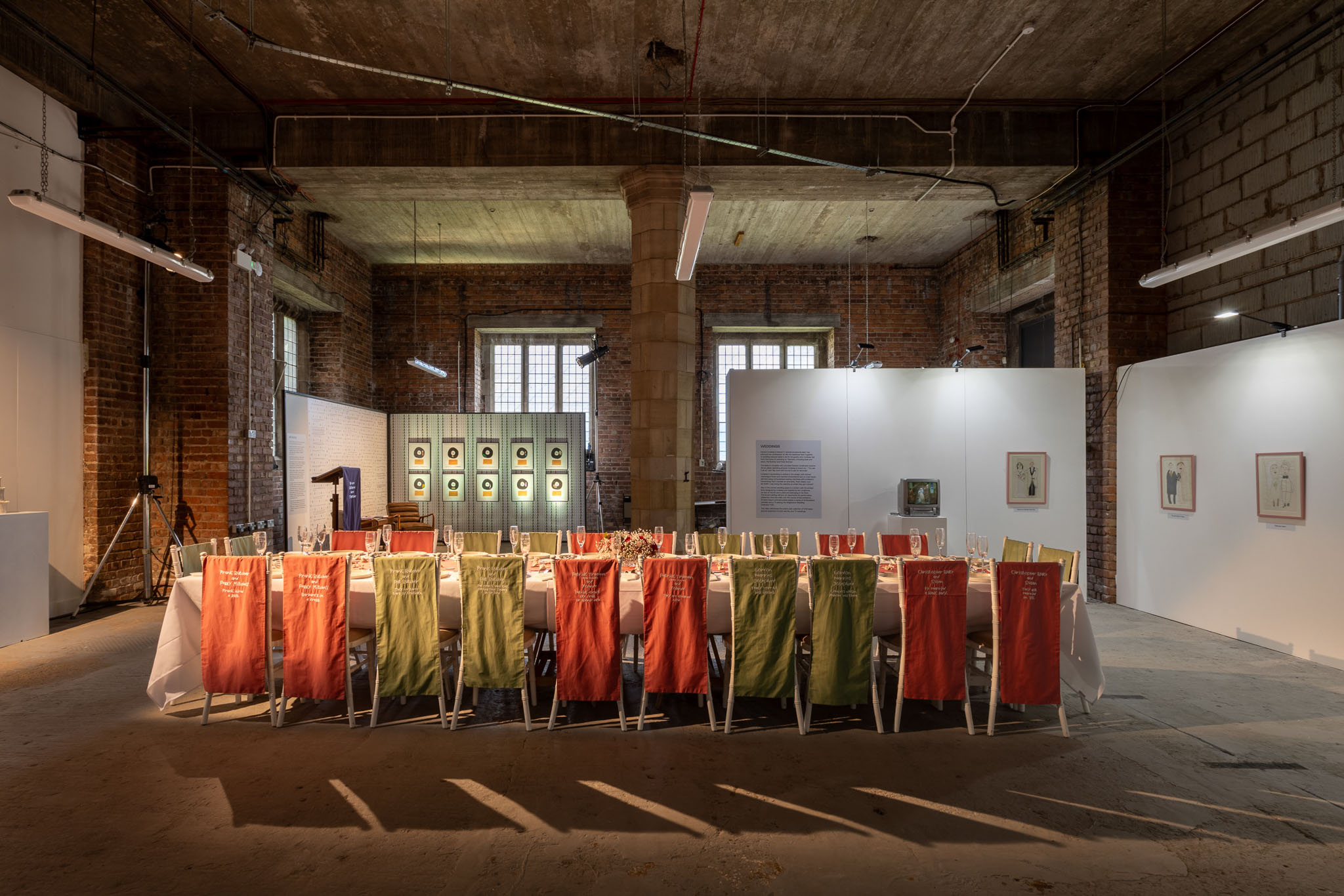 Split into three parts, one area of the exhibition focused on ‘births’, with a list of the names of people he had interacted with, the year they were born, and an iconic song released that year – specific knowledge Lindezey holds. In ‘marriages’, a huge wedding table was set for 24 iconic guests, inspired by Lindezey’s fond memories of watching TV.