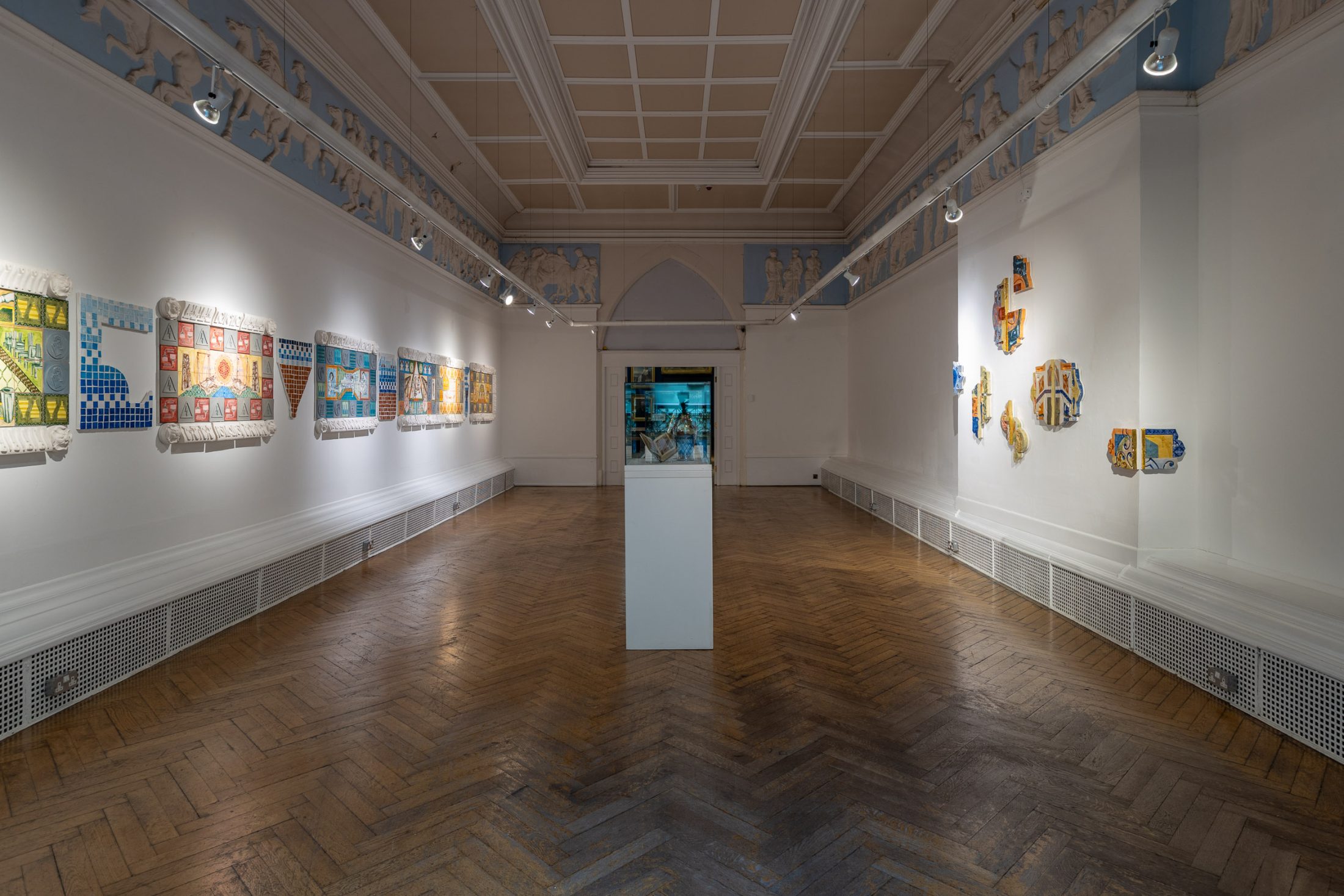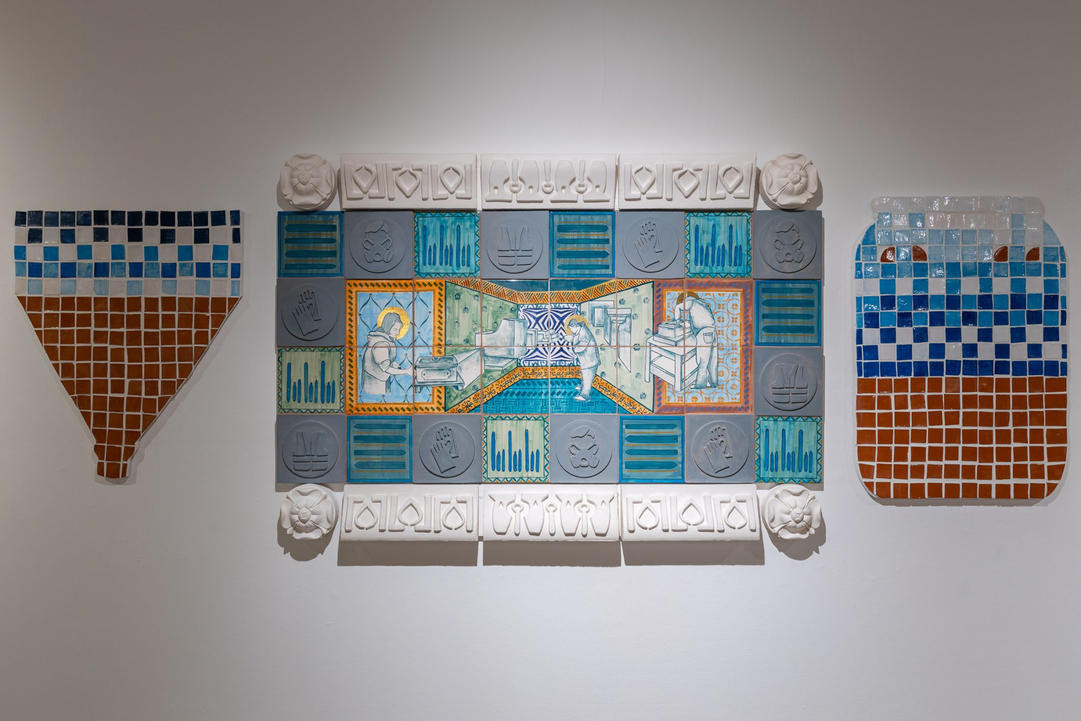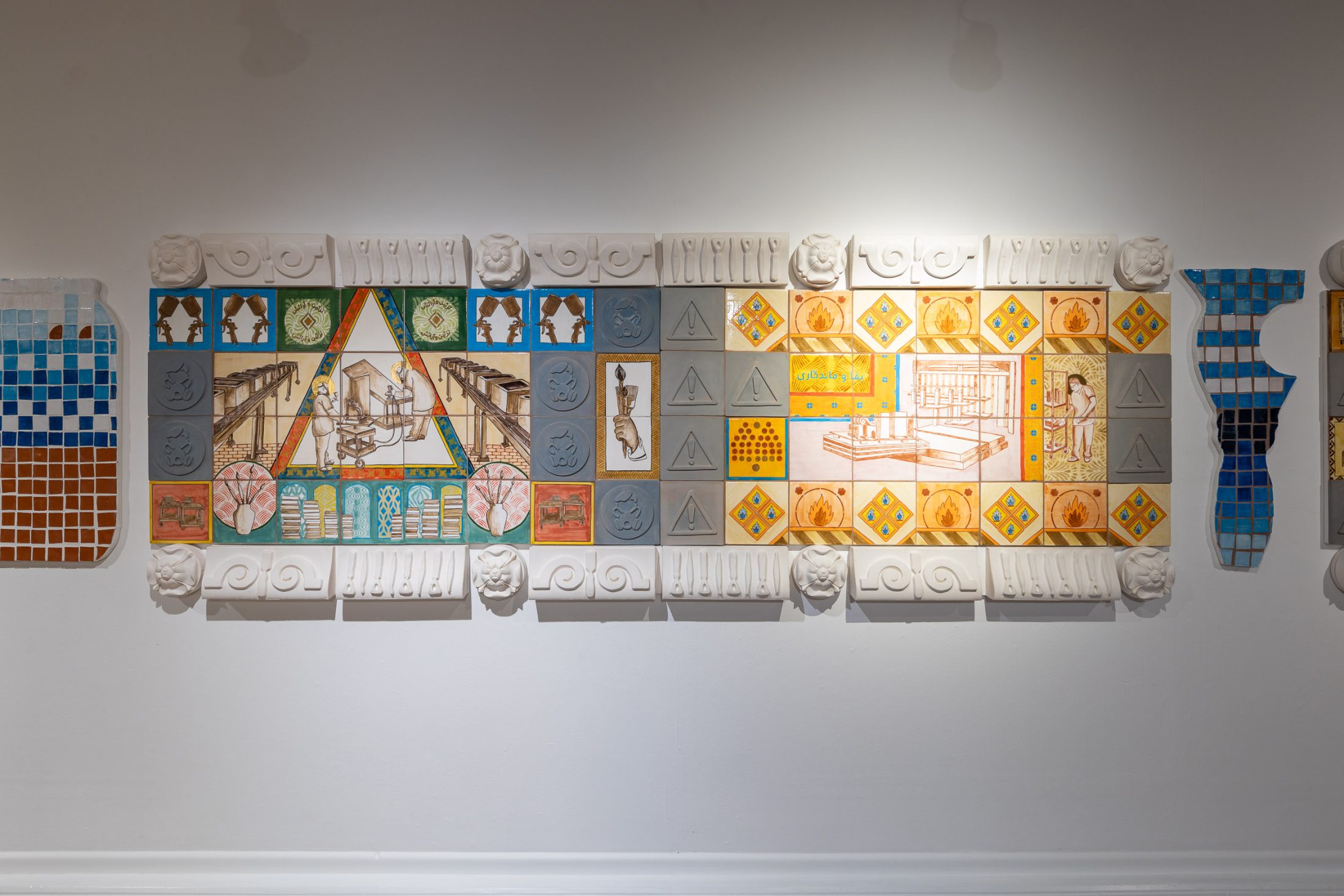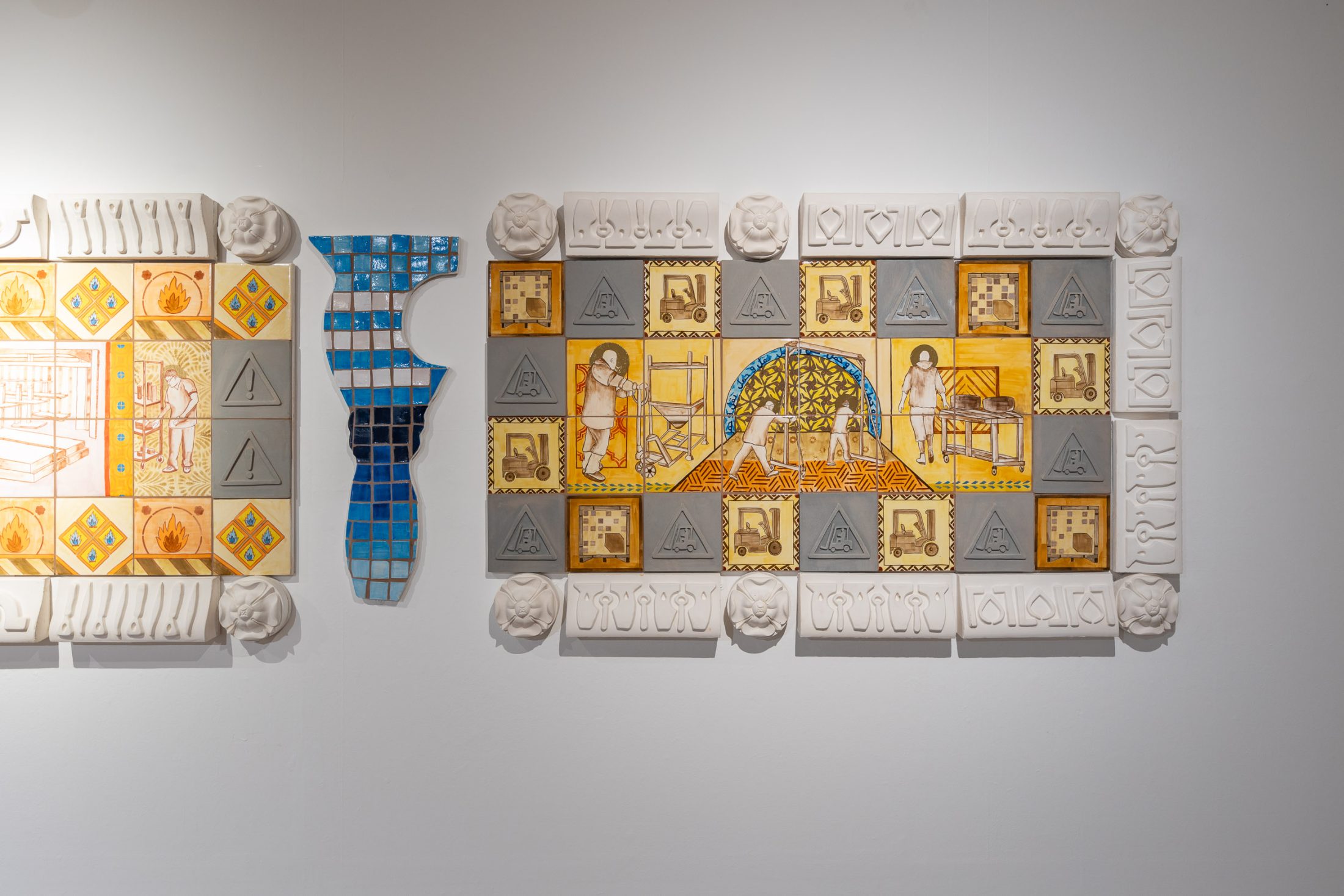 On the opposite wall hang pieces inspired by the factory’s work, mimicking fragments of architectural structures from magnificent buildings. Similarly to the manuscripts held in the museum’s collection, the pieces evoke a sense of historical and cultural importance. They preserve a skill and expertise that both artist and manufacturer believe should be protected. These pieces are displayed in dialogue with objects from the museum’s archives that have inspired the work.
