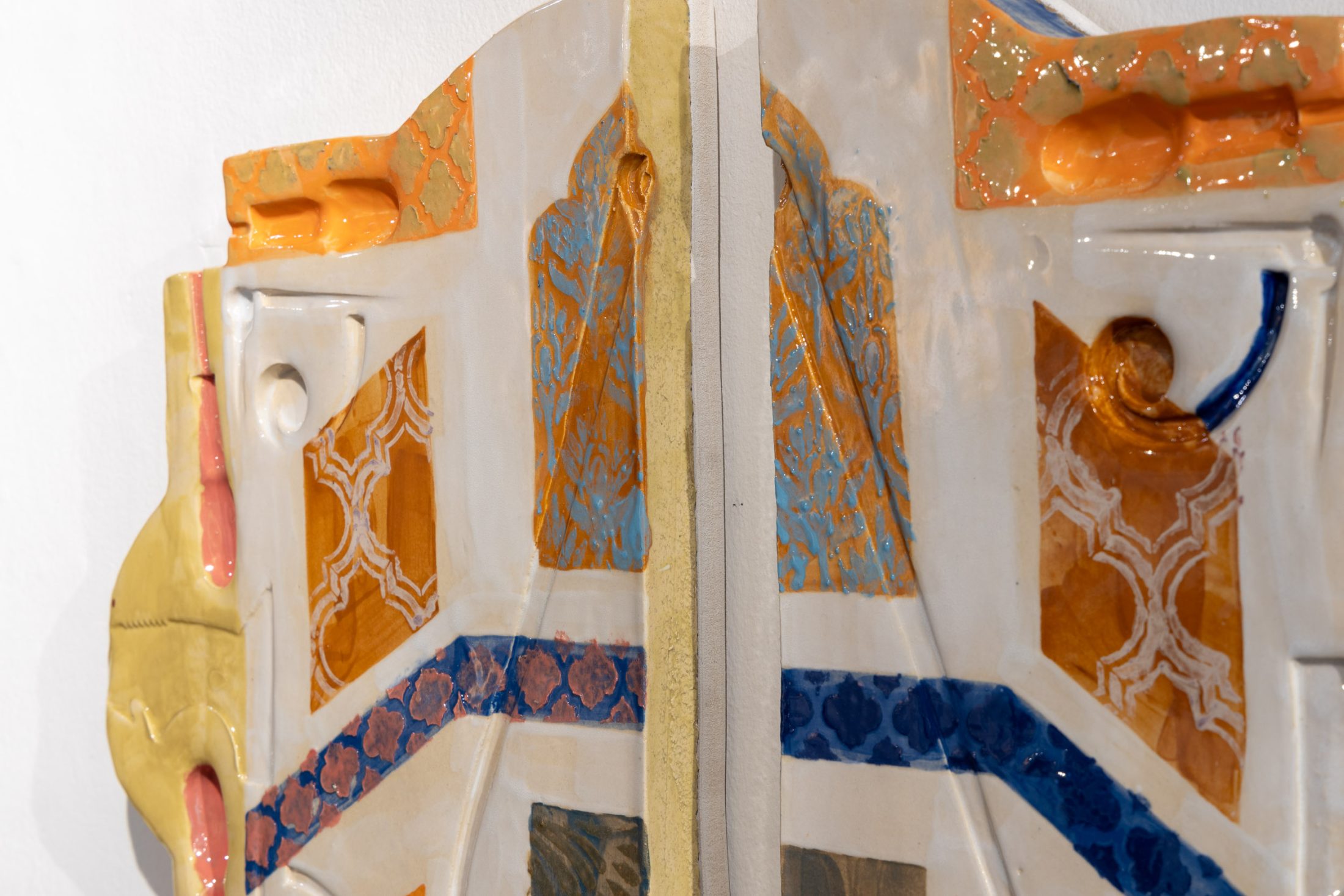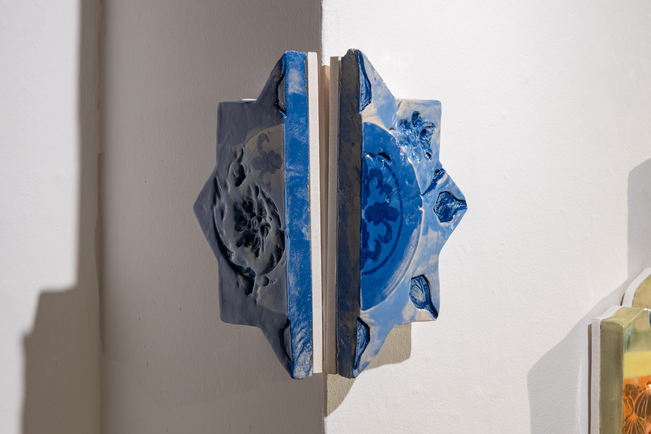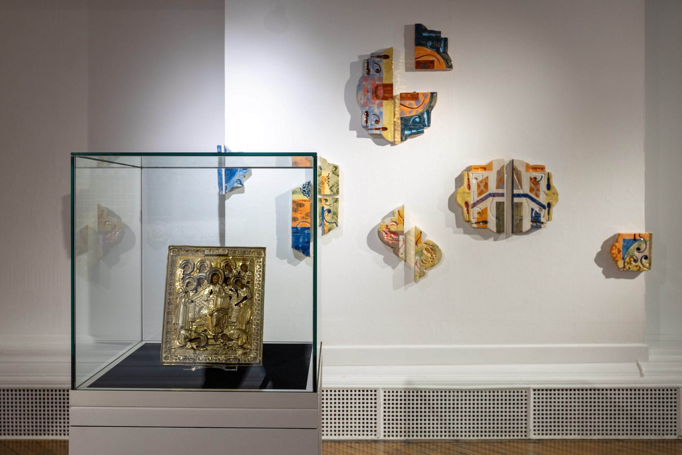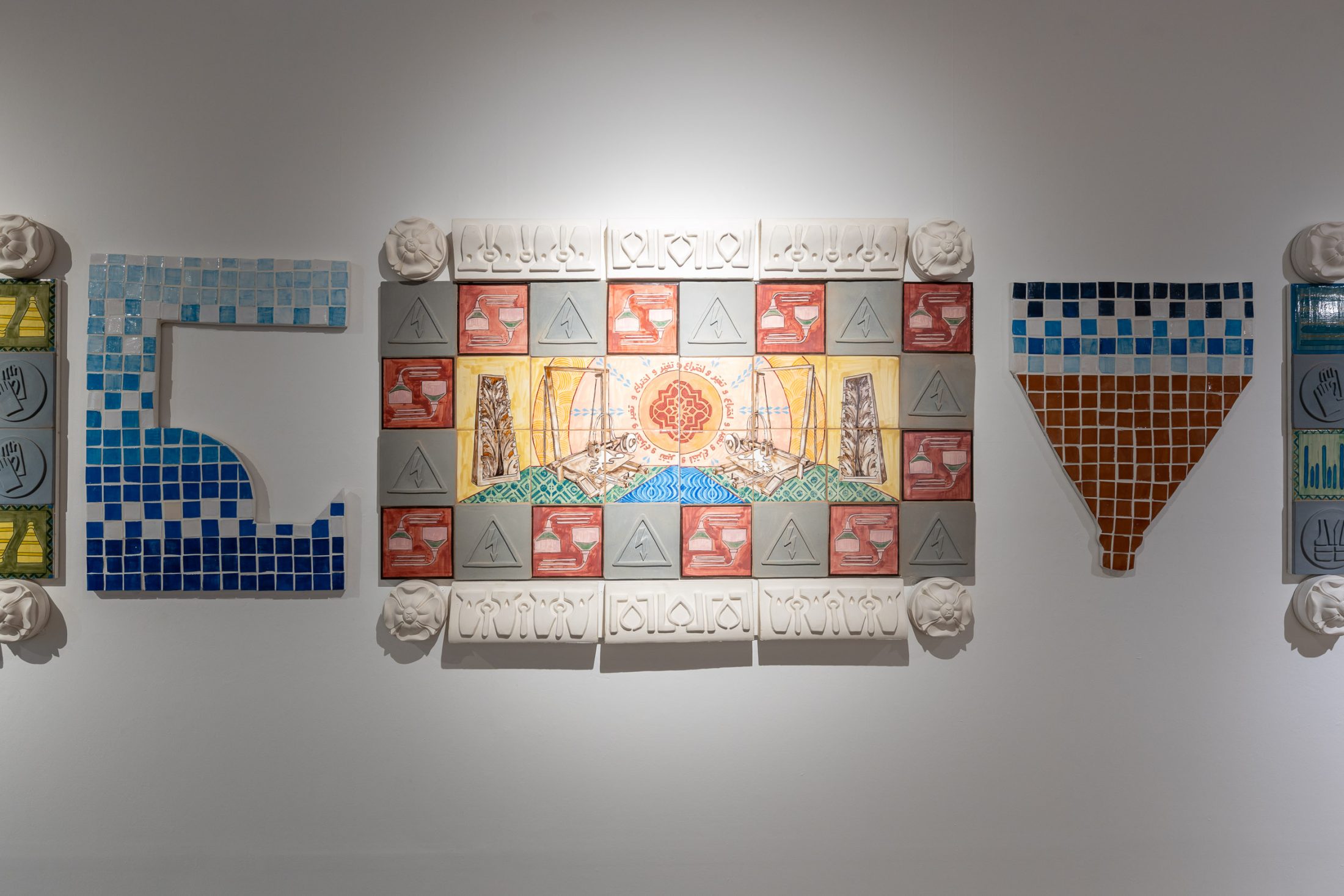 On the opposite wall hang pieces inspired by the factory’s work, mimicking fragments of architectural structures from magnificent buildings. Similarly to the manuscripts held in the museum’s collection, the pieces evoke a sense of historical and cultural importance. They preserve a skill and expertise that both artist and manufacturer believe should be protected. These pieces are displayed in dialogue with objects from the museum’s archives that have inspired the work.