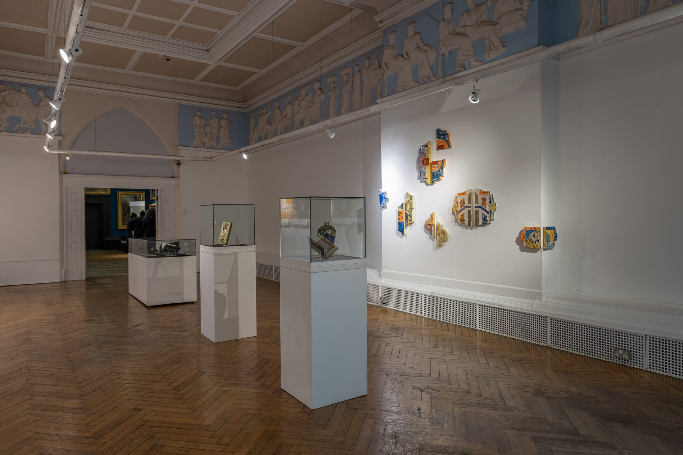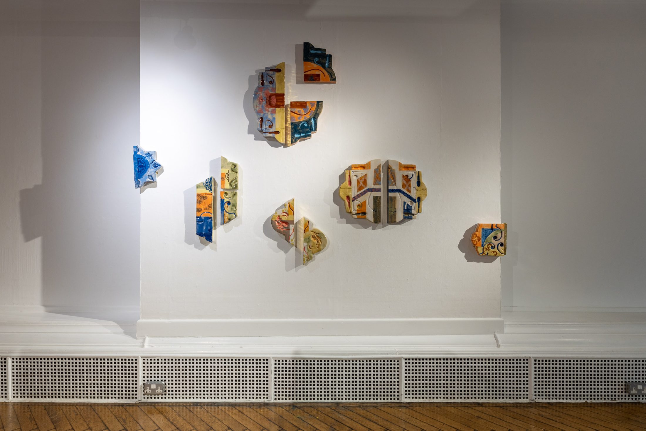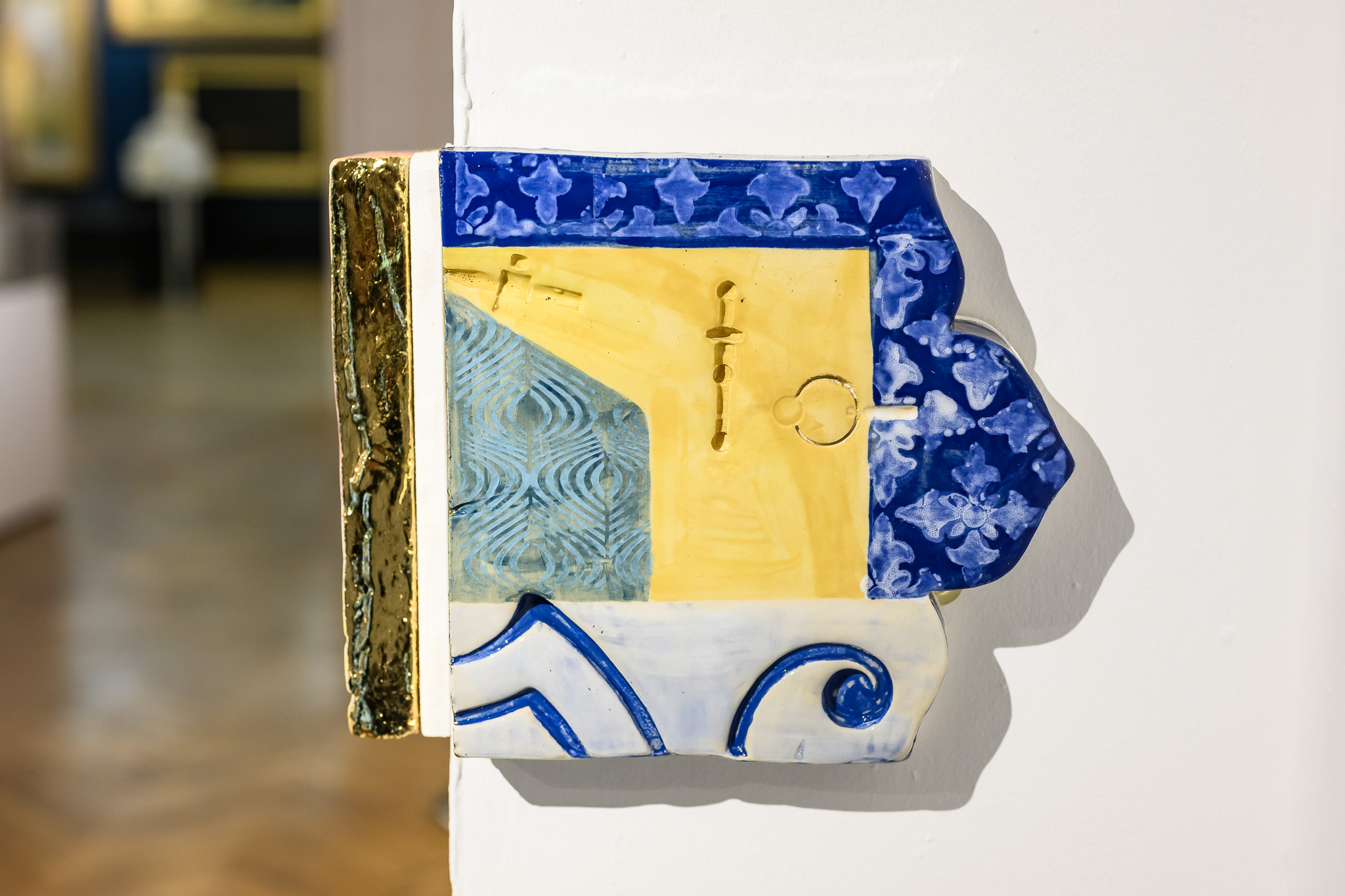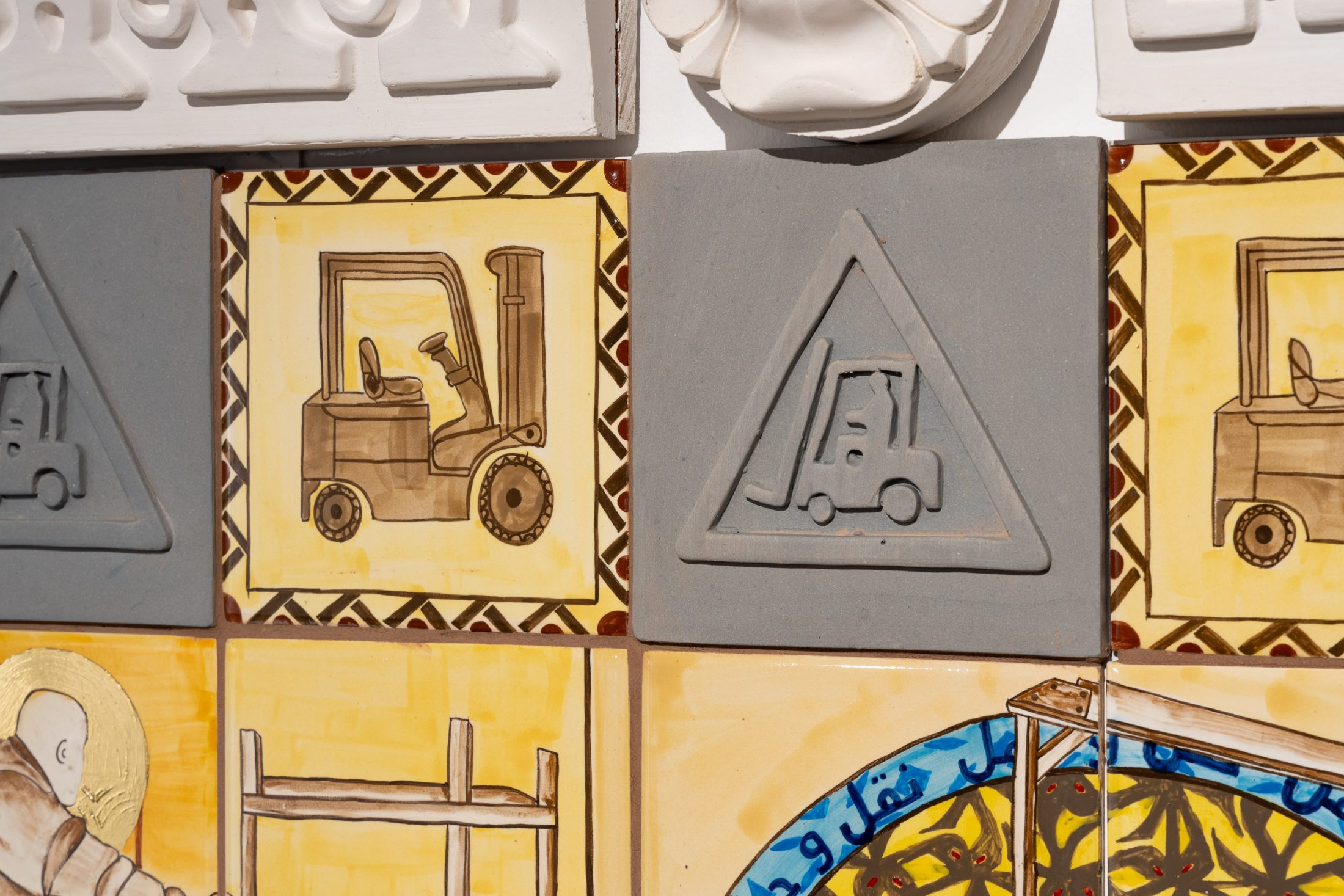 On the opposite wall hang pieces inspired by the factory’s work, mimicking fragments of architectural structures from magnificent buildings. Similarly to the manuscripts held in the museum’s collection, the pieces evoke a sense of historical and cultural importance. They preserve a skill and expertise that both artist and manufacturer believe should be protected. These pieces are displayed in dialogue with objects from the museum’s archives that have inspired the work.