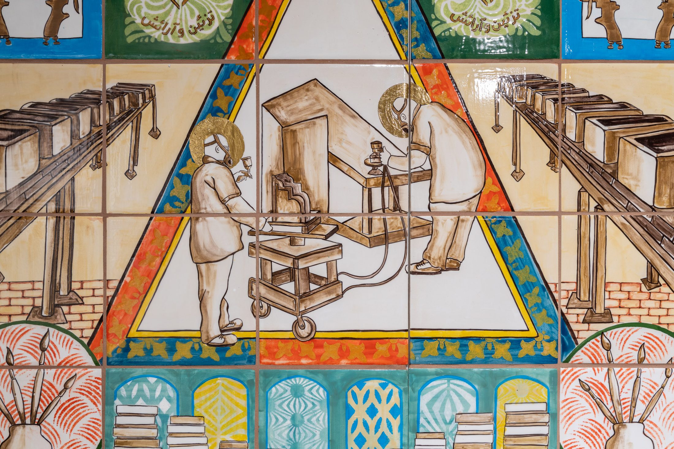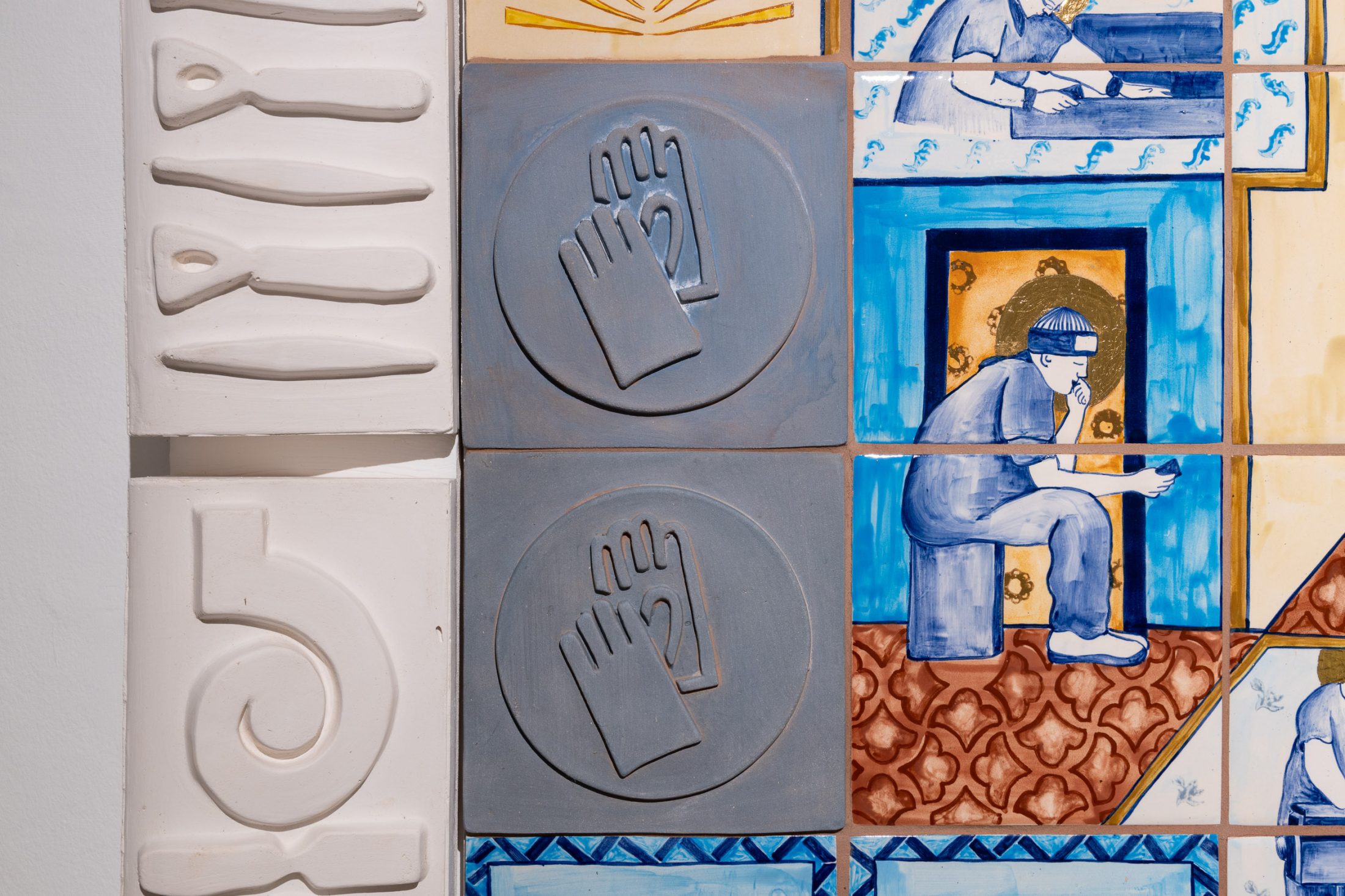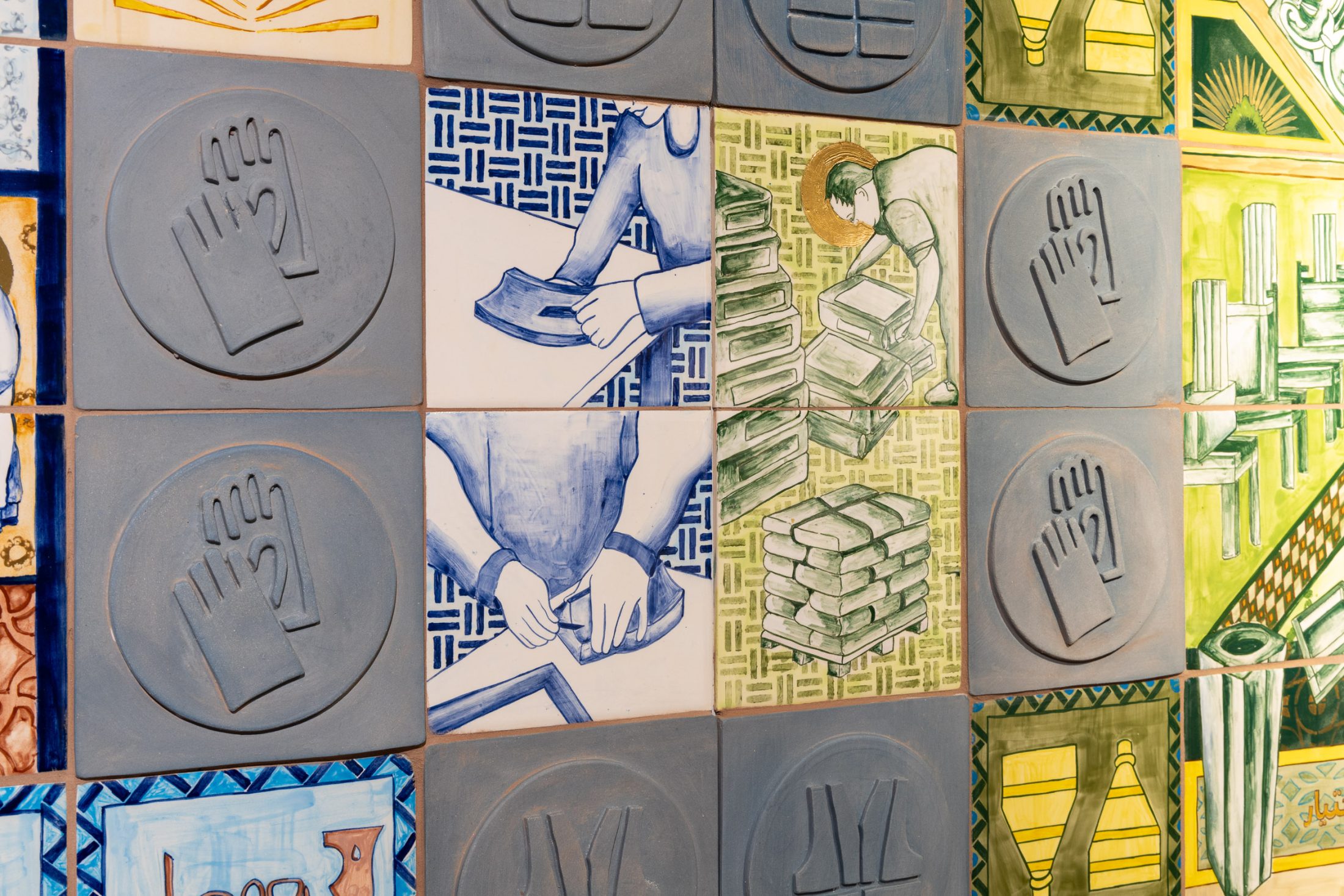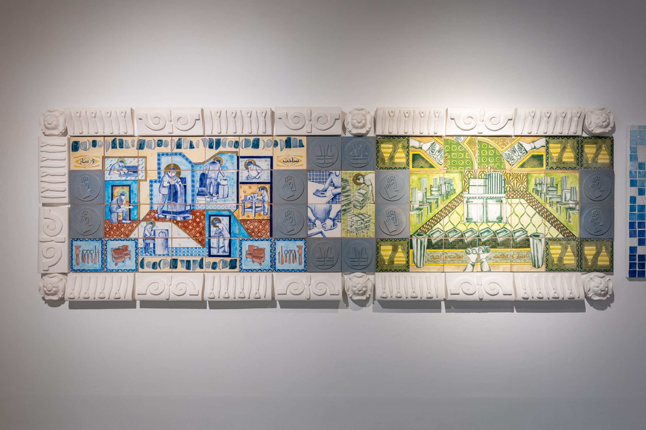 Using these influences, Aamir conceived a contemporary ceramic tapestry – one which would illustrate the gestures of the workforce and honour them for their skill and expertise. Hand-painted with colour and details in gold, the 11-metre ceramic work tells the story of craftsmanship at Darwen Terracotta and Faience – a place dedicated to preserving traditional techniques, whilst also embracing innovation.