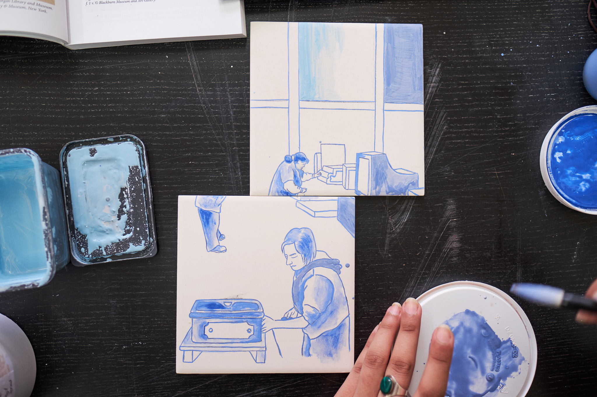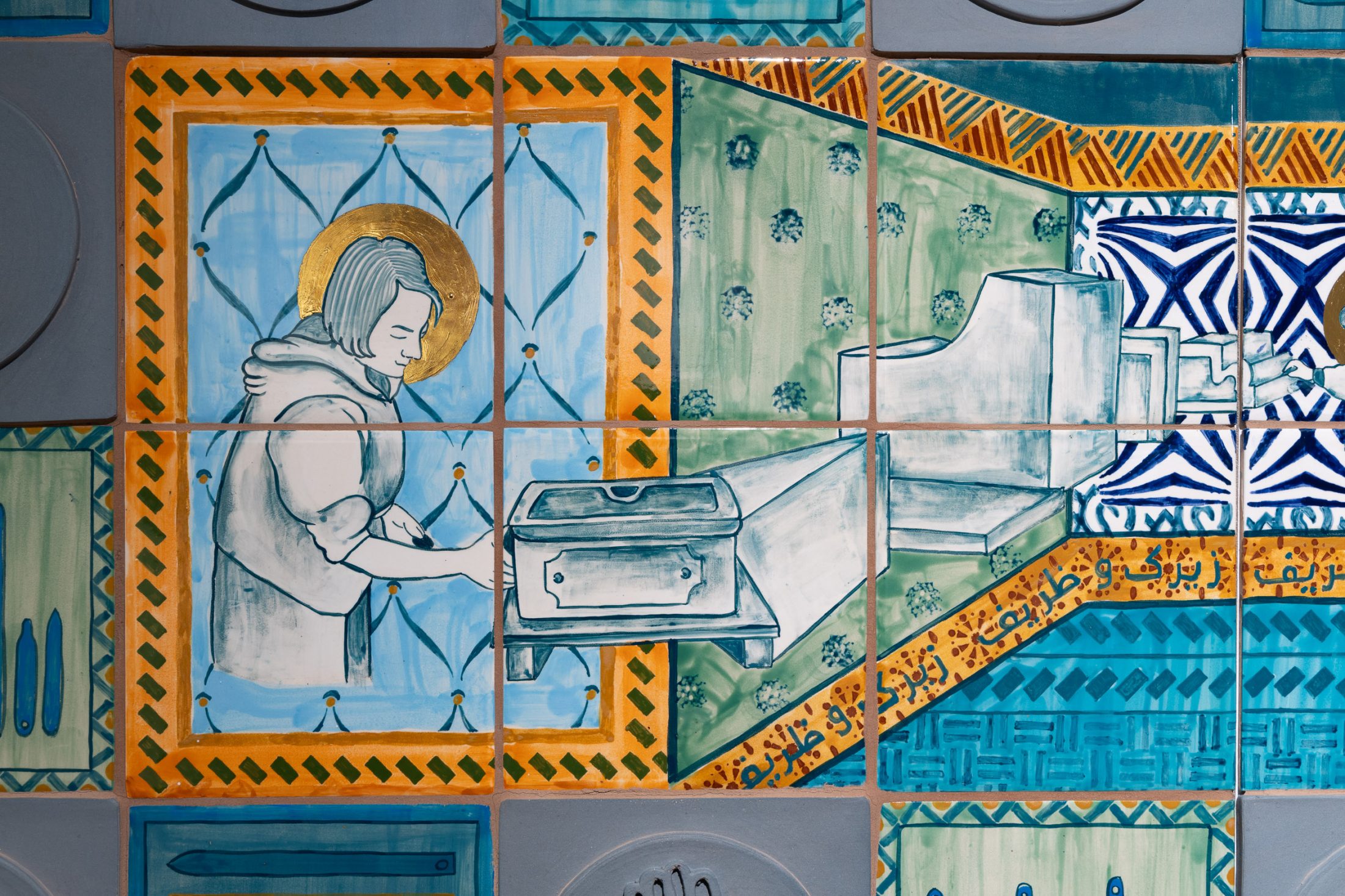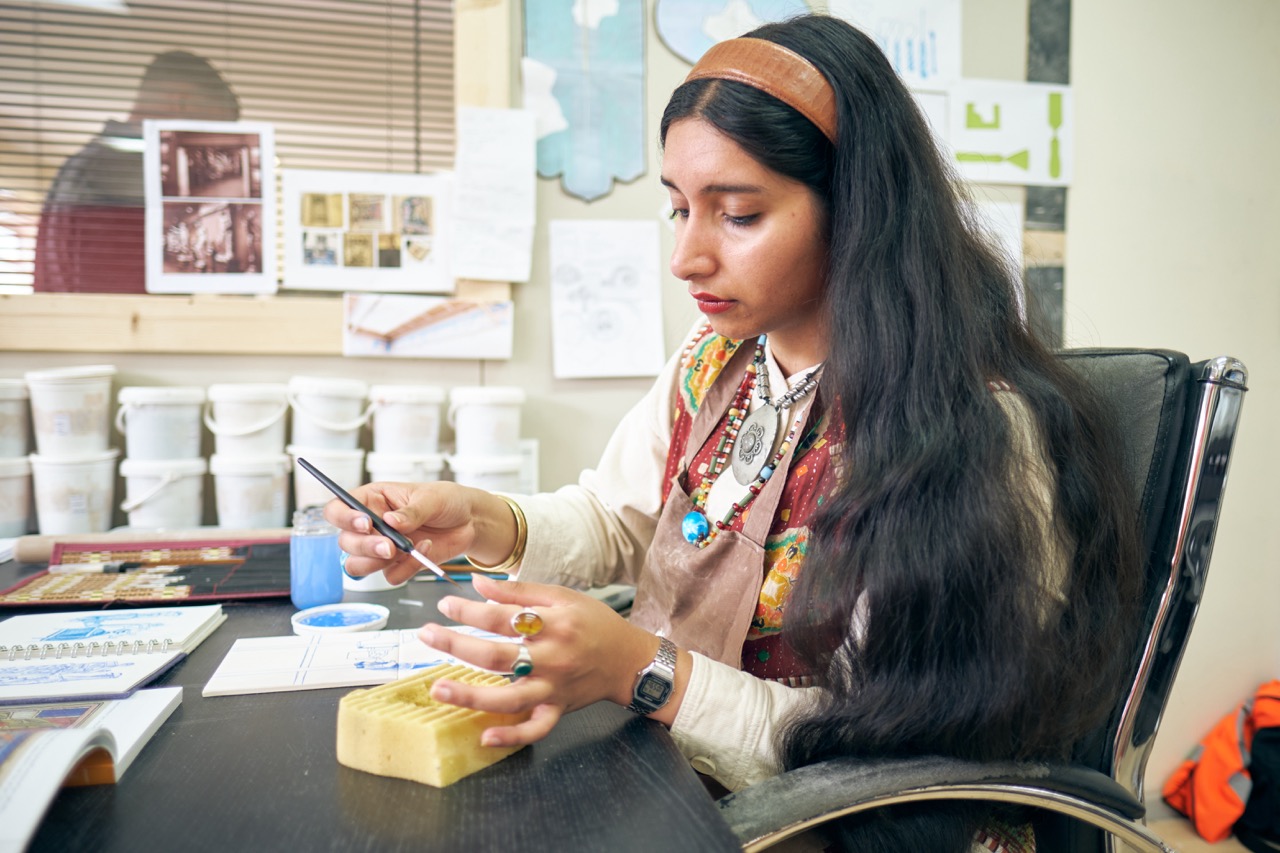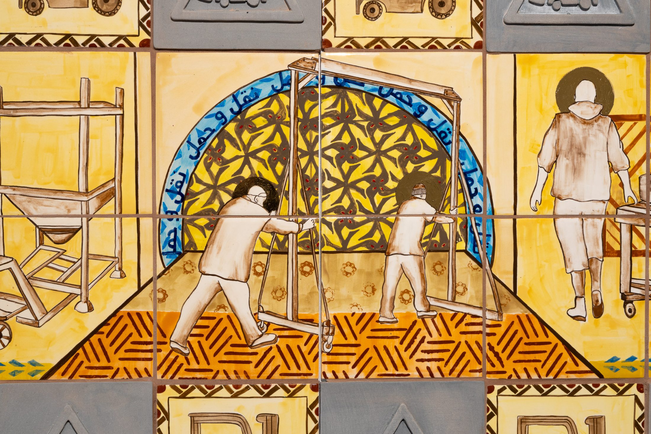 Using these influences, Aamir conceived a contemporary ceramic tapestry – one which would illustrate the gestures of the workforce and honour them for their skill and expertise. Hand-painted with colour and details in gold, the 11-metre ceramic work tells the story of craftsmanship at Darwen Terracotta and Faience – a place dedicated to preserving traditional techniques, whilst also embracing innovation.