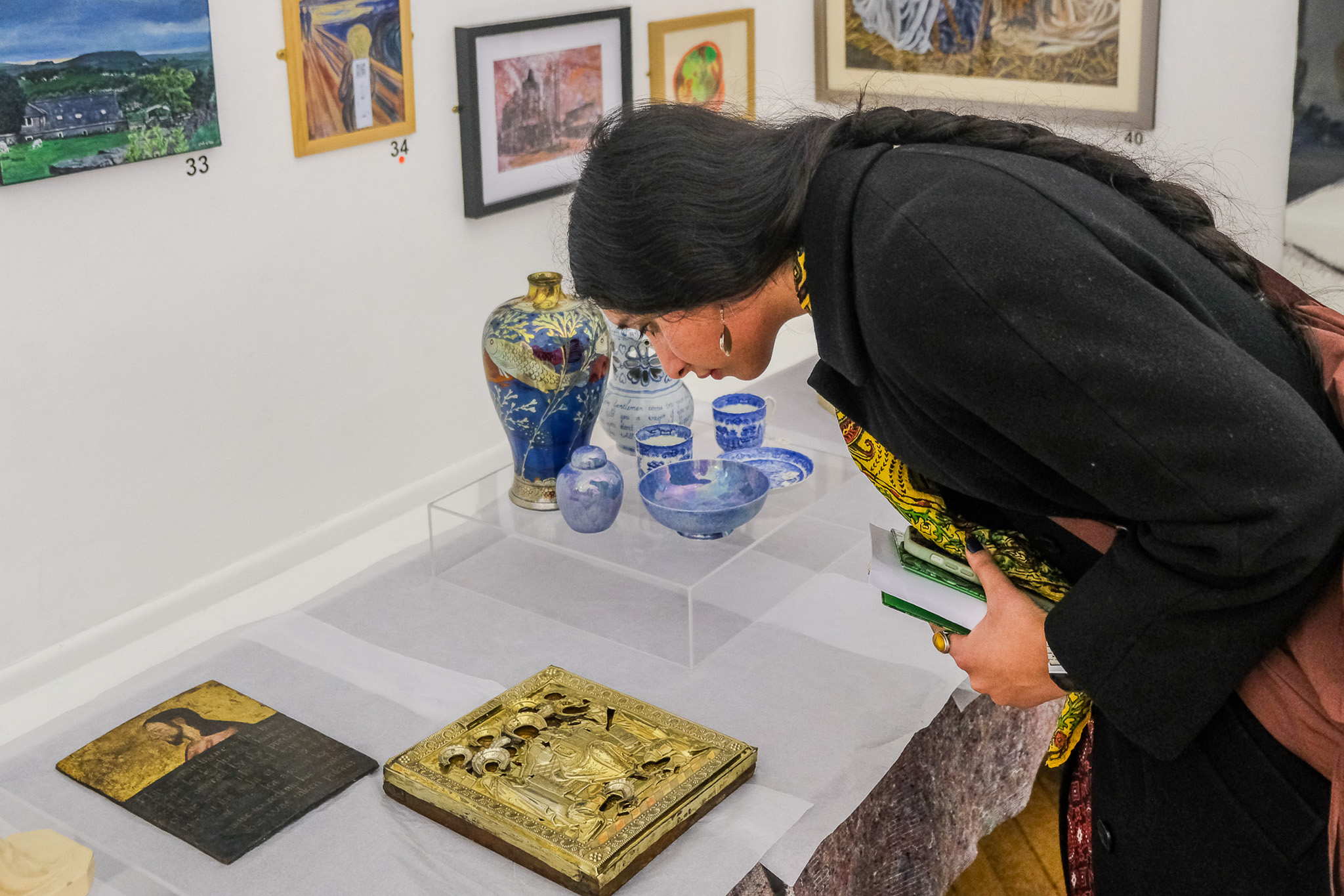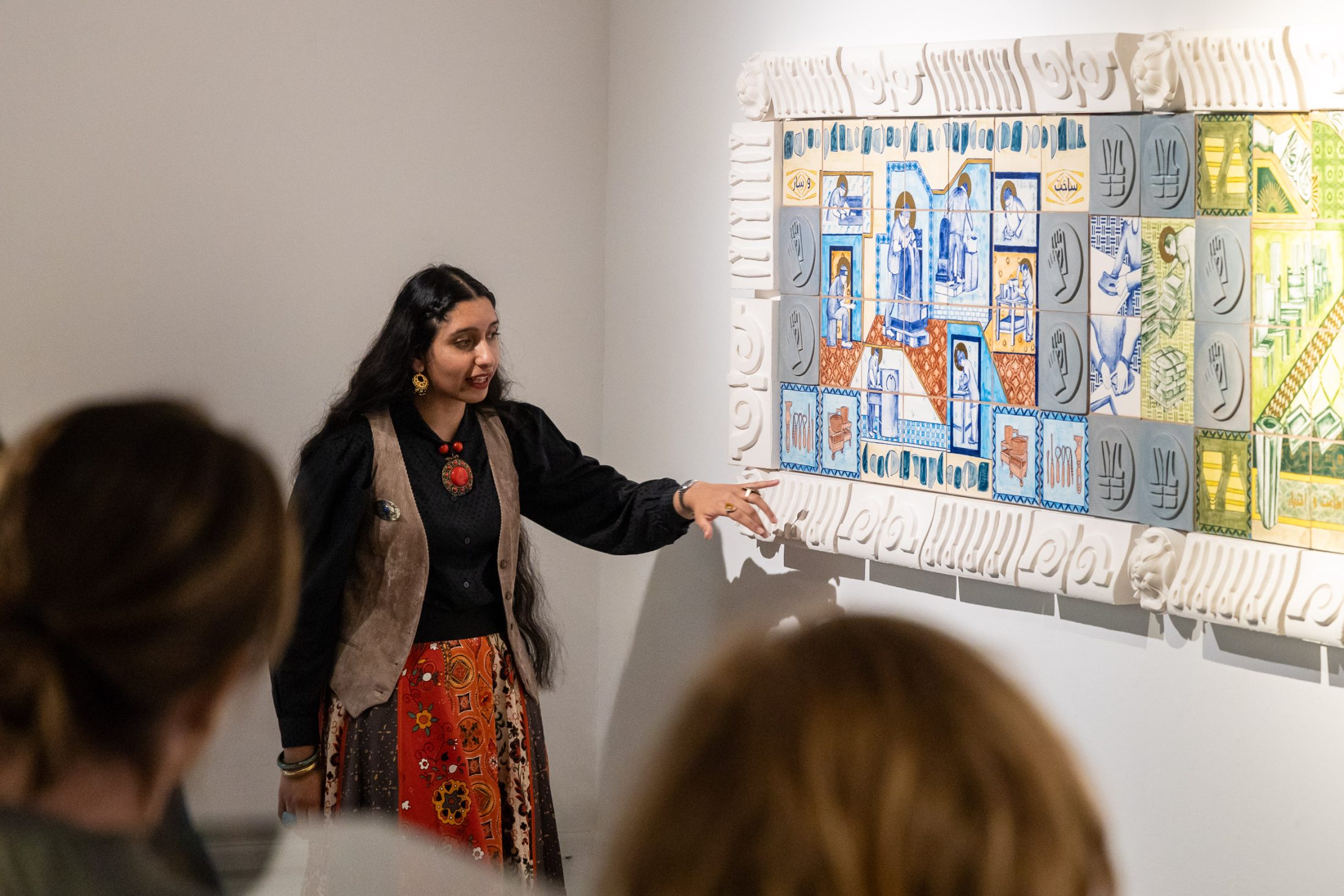 During this time, Aamir also spent time at Blackburn Museum & Art Gallery, exploring their collection and the site of the Watercolour Gallery, where Infinite Hands is exhibited. Pieces which emulated storytelling, already an important aspect of her practice, stood out to her, as well as the relief works of Greek figures from the 1800s running the length of the space.