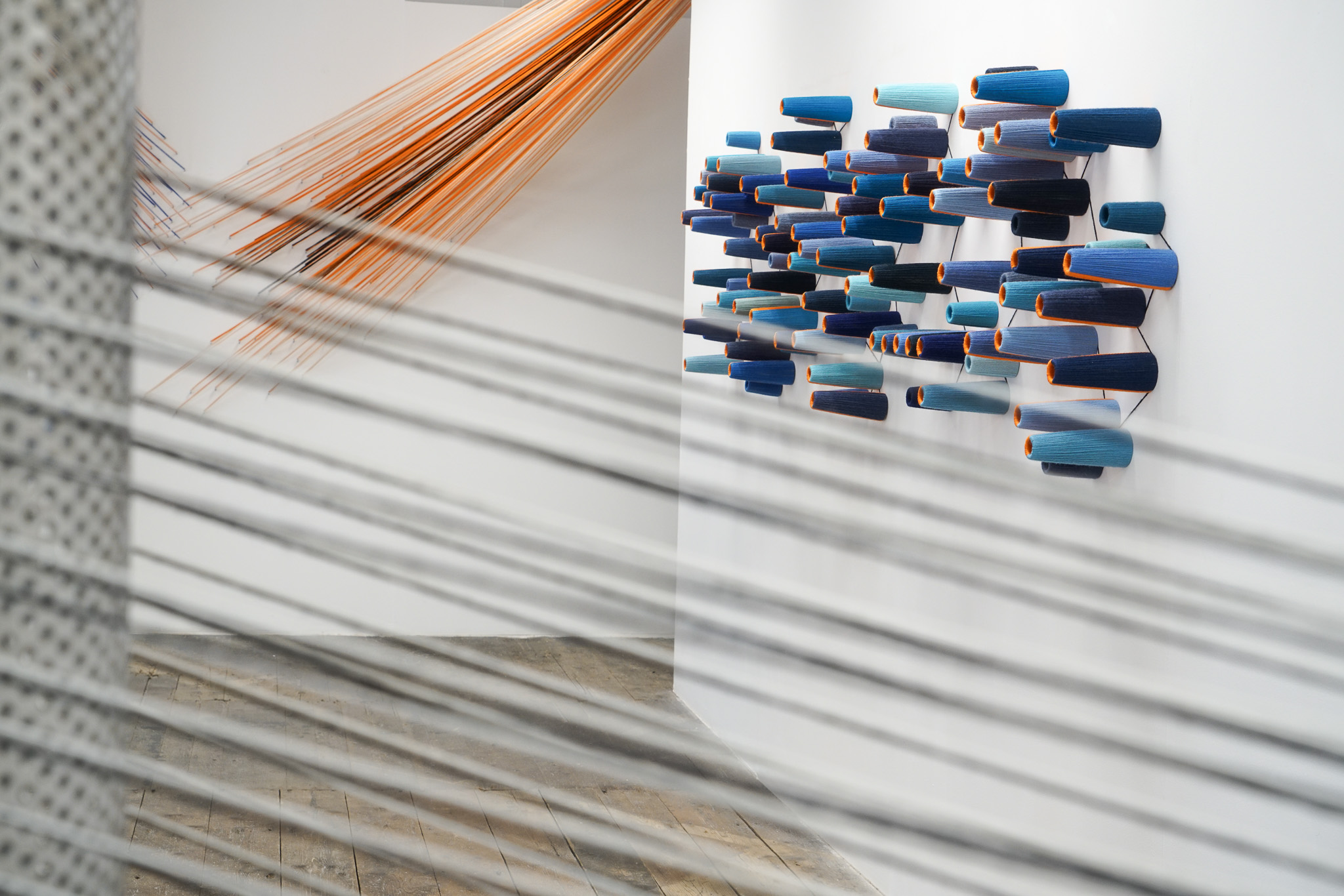 To the front of the Church Street gallery space was the work of Anna Ray. Anna was paired with the Forbo Flooring manufacturer. For her presentation, she had produced some gorgeous textile pieces made from offcuts she had found in the factory. For one work, she had strung up thick stands of woolly fibres, in a variety of colours, mostly a deep navy, each strand intermittently winched in by satisfyingly rich bands of fuzzy coloured fibres. Owing to the vibrant and joyful colour palette, it was extremely easy to instinctively feel positive towards it, though it had an uncanny quality to it… what was this thing we were looking at? How did she know where to start when she created these pieces?