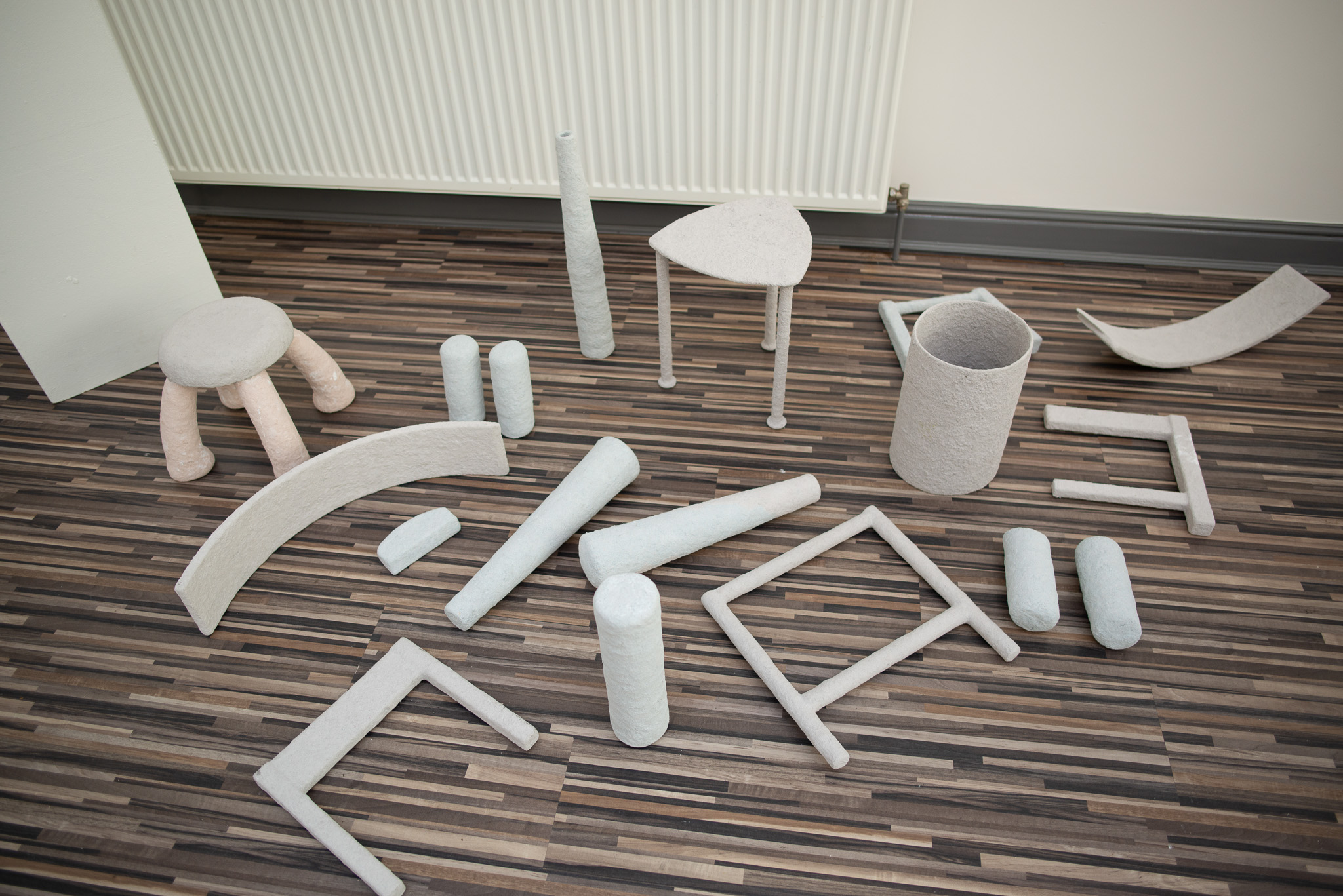 Over the course of the festival weekend, an accumulation of sculptural work developed that explored the properties of paper clay, and how it can be applied to existing shapes and objects. The space was inhabited by paper waste, furniture parts, and artworks at various stages of Maisie’s making process.